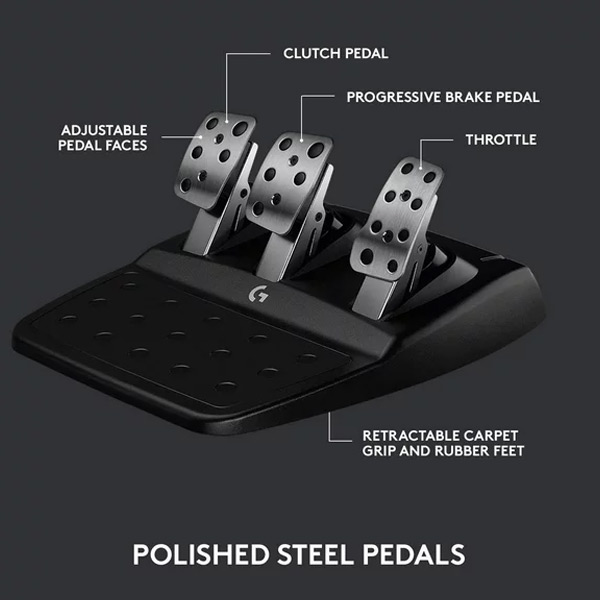 در کنار این فرمان فوق العاده، دو بخش دیگر نیز وجود دارد که در واقع می توان گفت از اجزای جدایی ناپذیر یک فرمان بازی هستند که شامل پدال ها و دسته دنده می شوند. فرمان بازی LOGITECH G923 دارای سه پدال است که شامل گاز، ترمز و کلاچ می شود. هر سه پدال از آلومینیوم با کیفیت ساخته شده اند تا حسی شبیه به پدال های واقعی را القاء کنند. این پدال ها دقیقا همان کارایی را که در یک ماشین واقعی باید داشته باشند دارند. پس هر چقدر پدال گاز را بیشتر فشار دهید سرعت افزایش پیدا می کند و برای ایستادن نیز باید پدال ترمز را فشار دهید. تعویض دنده نیز با کمک کلاچ است.